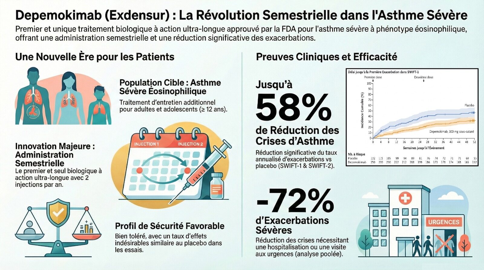 L’approbation de la FDA s’appuie sur les résultats des essais cliniques de phase III SWIFT-1 et SWIFT-2. Ces études ont montré que deux injections annuelles de 100 mg permettaient de réduire significativement le nombre de crises d’asthme sévères par rapport à un placebo. Les chercheurs observent notamment une diminution de 72 % des crises nécessitant une hospitalisation ou une prise en charge aux urgences.