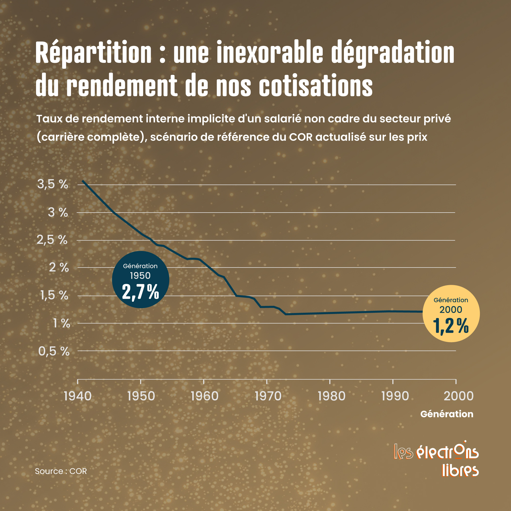 • (2) Cette affirmation était vraie au moment de la publication de l’article, mais le livret A a baissé entre temps à 1,7 % en nominal (août 2025). Avec cette baisse, le taux du livret A repasse en dessous du TRI de la répartition projeté pour les actifs d’aujourd’hui. Un TRI proche du taux réel du livret A correspond à un bien piètre investissement si l’on se projette sur une durée d’investissement correspondant à plus de 40 ans de cotisations.”