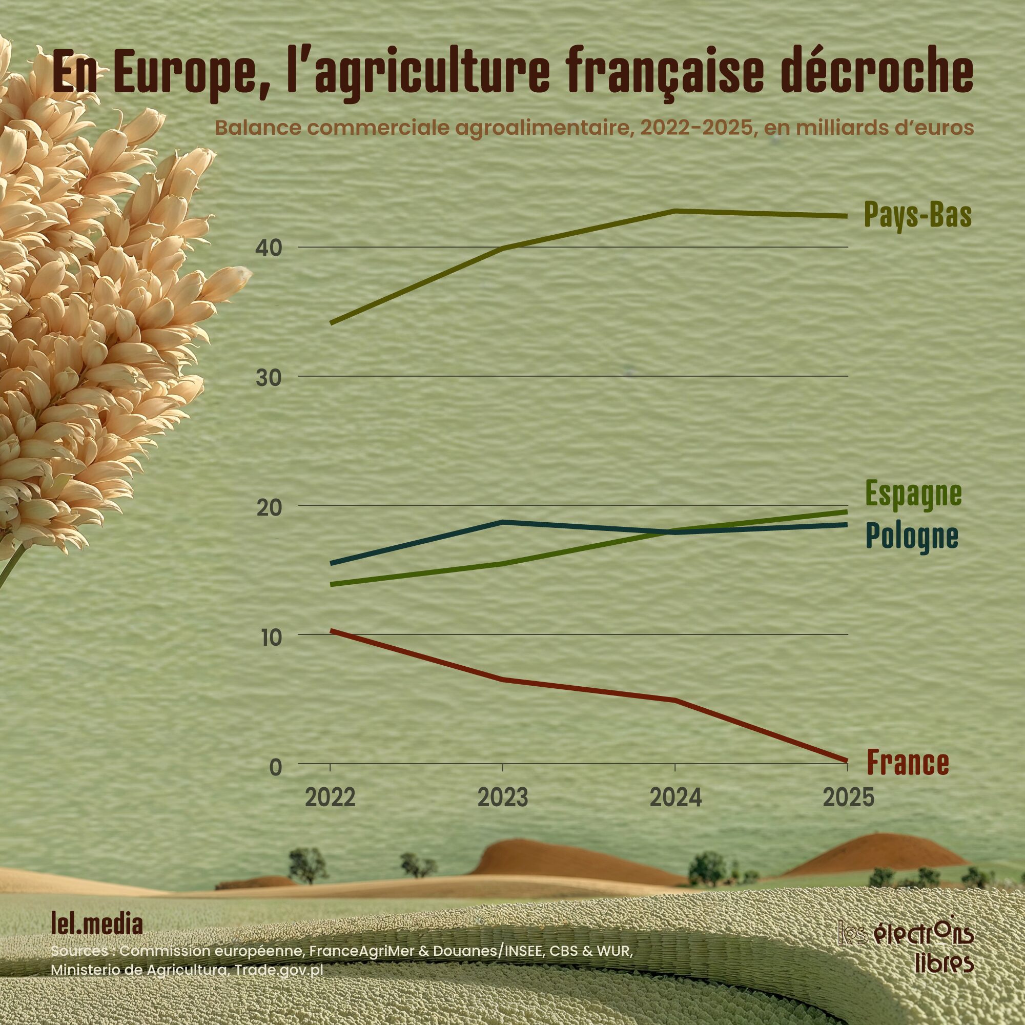 Ce n’est pas une fatalité en Europe. L’Espagne enchaîne les excédents records, les Pays-Bas combinent productivité, technologie et logistique portuaire pour rester la grande plateforme agroalimentaire du continent, et la Pologne monte en puissance sur les viandes et produits transformés à coûts compétitifs.