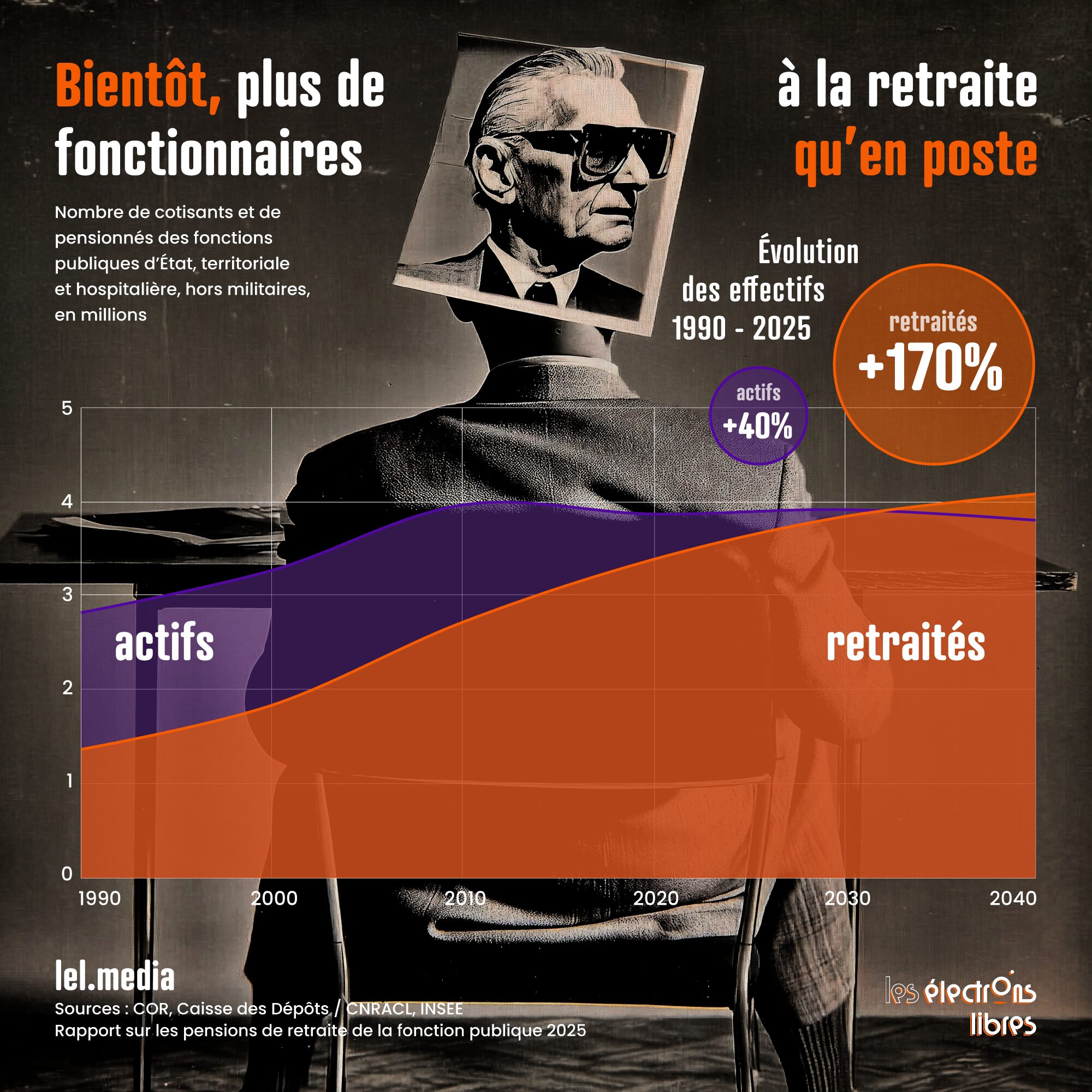 En 1990, on comptait deux fonctionnaires civils actifs pour un retraité. Sauf que depuis, le nombre de ces derniers a bondi de 170 %. Ils sont aujourd’hui plus nombreux que les cotisants dans la fonction publique d’État et la fonction publique hospitalière. Seule la forte hausse des effectifs territoriaux au début des années 2000 a permis de retarder la bascule, mais bientôt il y aura davantage de fonctionnaires à la retraite qu’en activité tous statuts confondus.