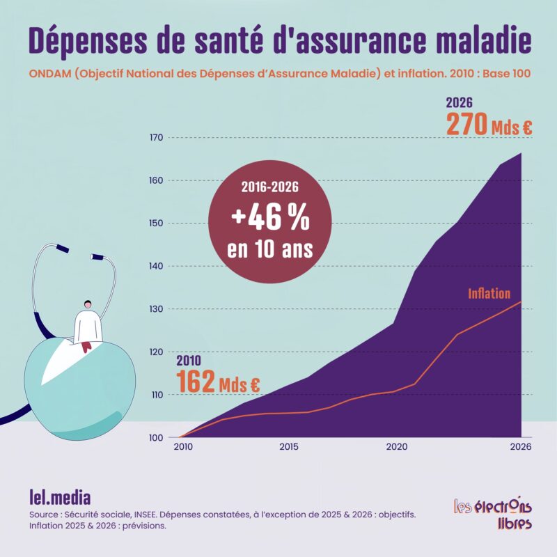 +46 % en 10 ans. Depuis 2020, les dépenses de santé de l’assurance maladie explosent. En cause, notamment, le vieillissement de la population : un assuré de plus de 75 ans a quatre fois plus de besoins qu’un assuré de 20–40 ans.