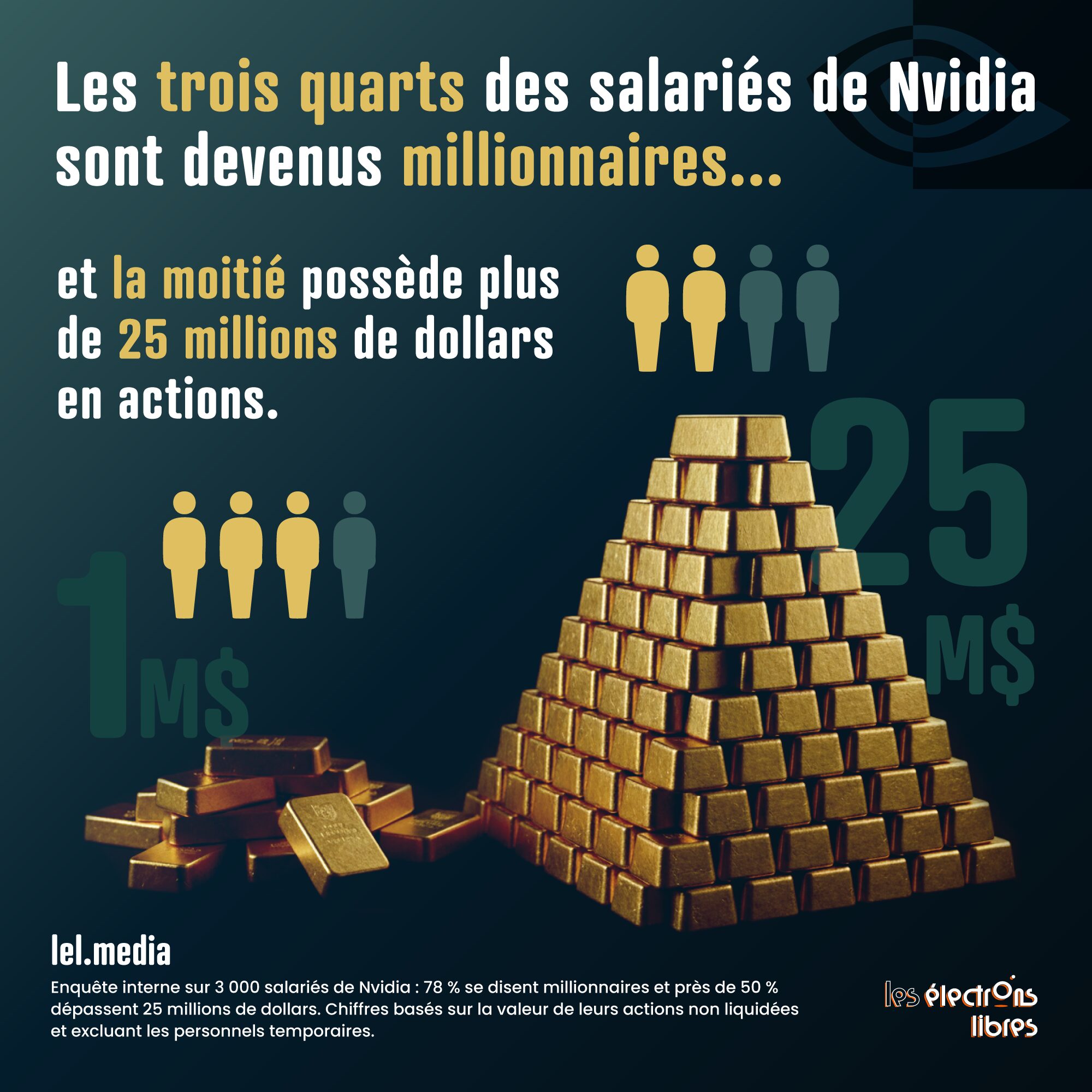 Nvidia n’a pas créé que des puces, elle a aussi créé une armée de millionnaires. 78 % des salariés détiennent plus d’1 million de dollars en actions, et la moitié dépasse 25 millions. La plus spectaculaire redistribution de richesses de l’histoire de la tech ?