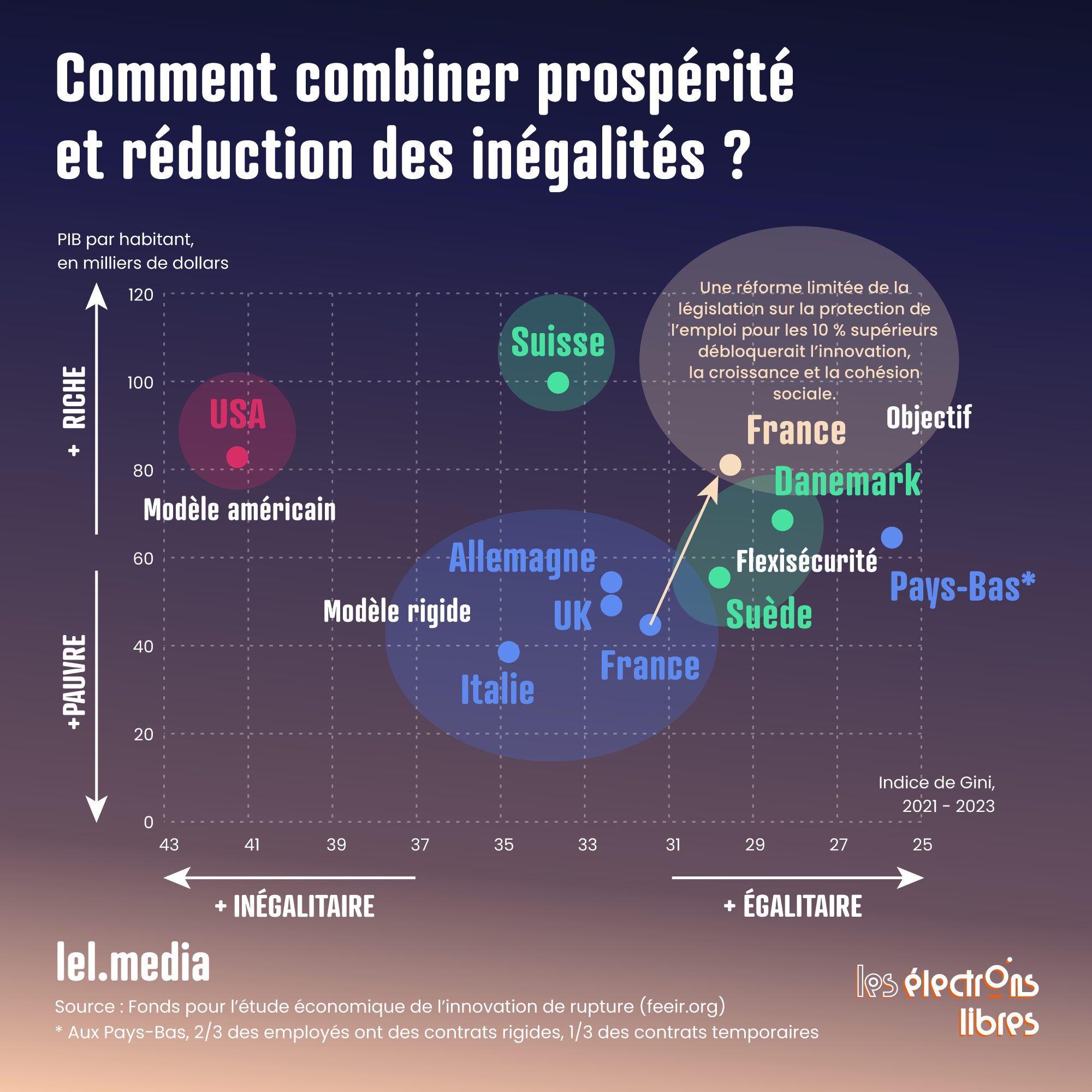 Les entreprises innoveraient plus, développeraient des produits attractifs et compétitifs, augmenteraient leurs chiffres d’affaires et leurs profits, donc recruteraient plus, donc paieraient plus d’impôts. Un cercle vertueux susceptible d’intéresser tous les bords politiques. Le Danemark génère un PIB par habitant 50% supérieur à la France, la Suisse 100% supérieur. Traduit en termes simples, les salaires sont 50% supérieurs aux Danemark, des petits aux grands. Le Smic est à 4300 euros par mois à Genève…