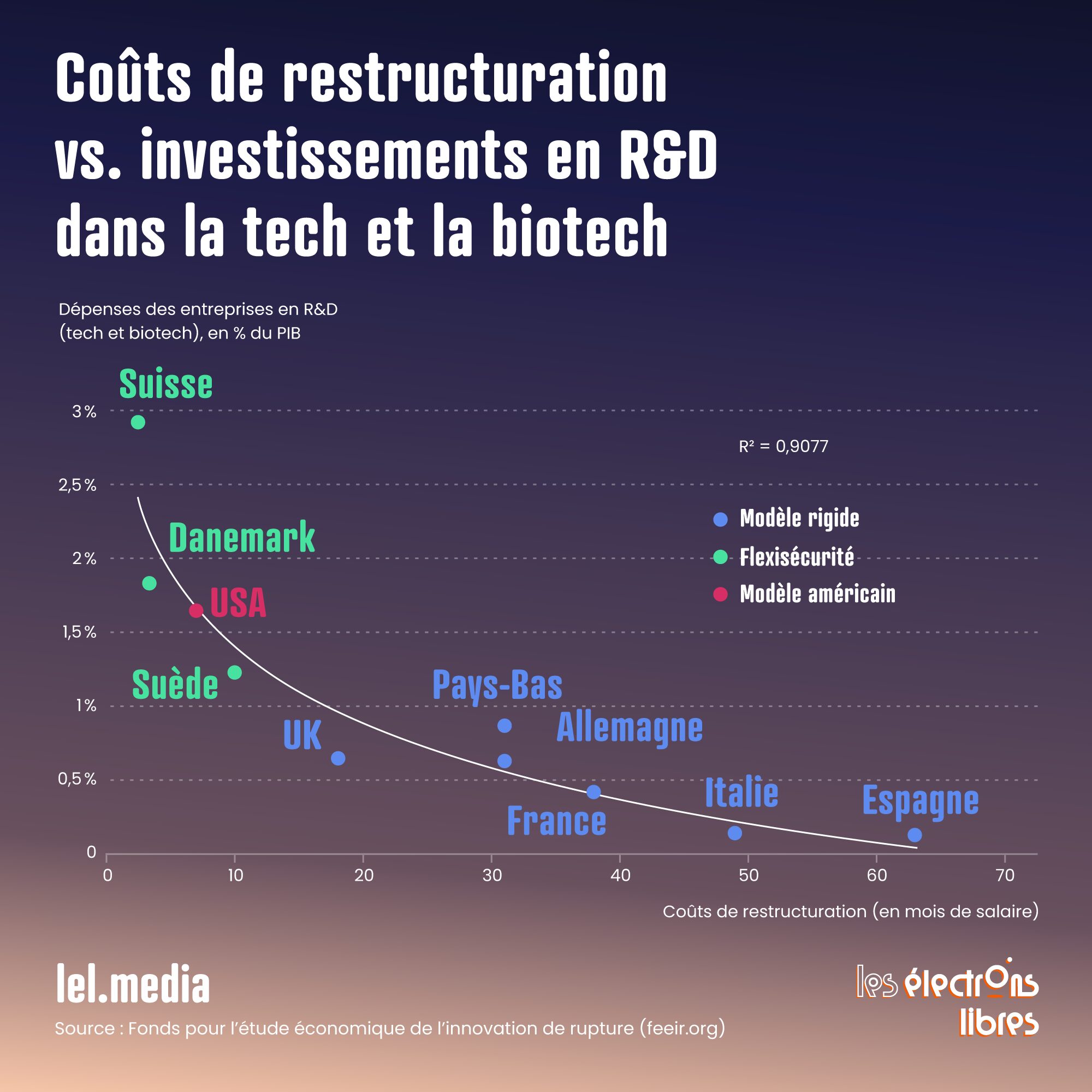« Flexisécuriser » le top 10% est audible à droite comme à gauche. Cette simple réforme restaurerait la rentabilité des investissements dans la R&D, où l’on n’emploie que des personnes très qualifiées. Si l’on reprend l’exemple danois, l’investissement privé en tech et en biotech passerait de 0,4% du PIB aujourd’hui à 2%, soit 50 Mds € par an d’investissements en plus. Sans un sou d’argent public ! Et le Danemark a réussi cela en 5 ans !