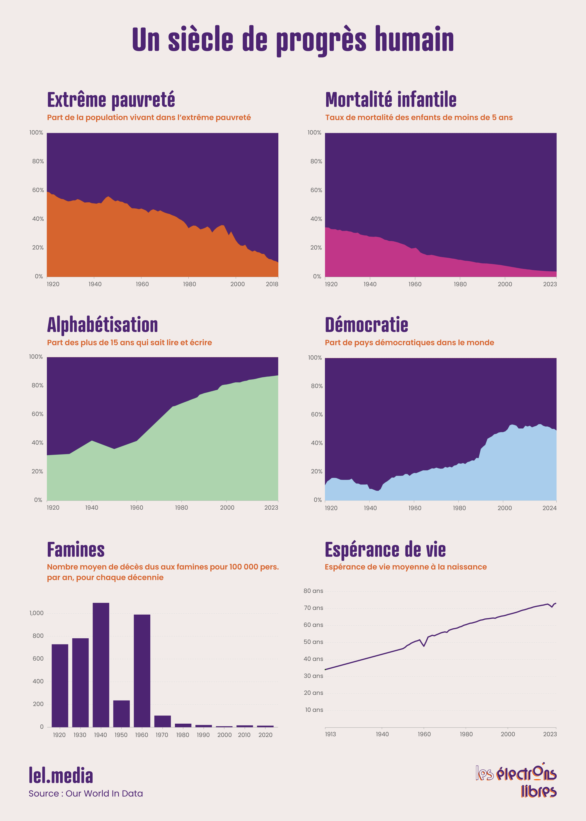 La découverte du travail de Hans Rosling a vraiment changé ma façon de voir les choses. Ce statisticien suédois charismatique prenait du recul et disait : « Regardons les données et l’évolution du monde, non pas sur le dernier jour, mais au fil des siècles. » Ce que l’on constate de cette manière, c’est que les humains ont fait des progrès incroyables face à des problèmes vraiment importants, dont beaucoup d’entre nous n’ont pas conscience.