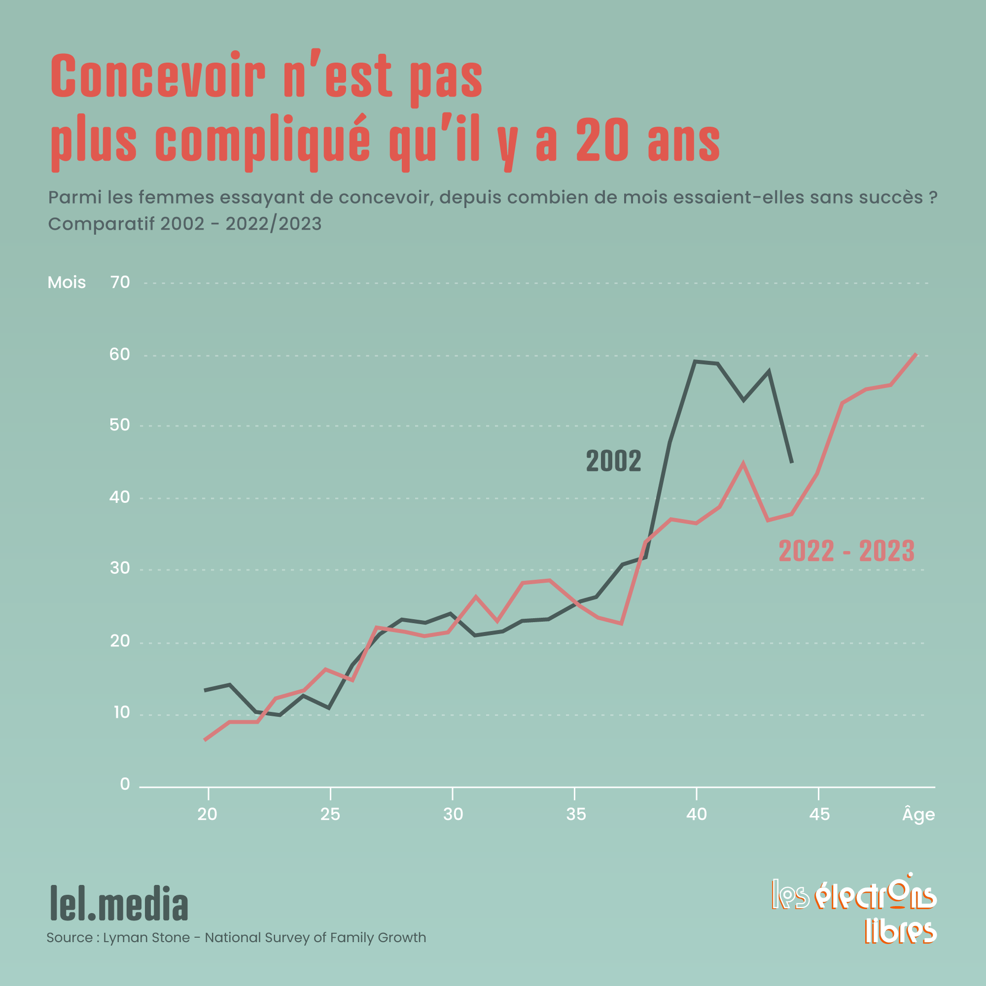 Les données de la National Survey of Family Growth (l’enquête de référence du CDC américain sur la famille et la fertilité) montrent que le temps passé en essai de conception, contrôlé par l’âge, n’a pas bougé entre 2002 et 2023. Pour les femmes dans la quarantaine, il a même diminué. Peu importe ce qu’on trouve dans les spermogrammes. Quand on mesure la vraie fertilité, celle qui produit des bébés, elle est stable.
