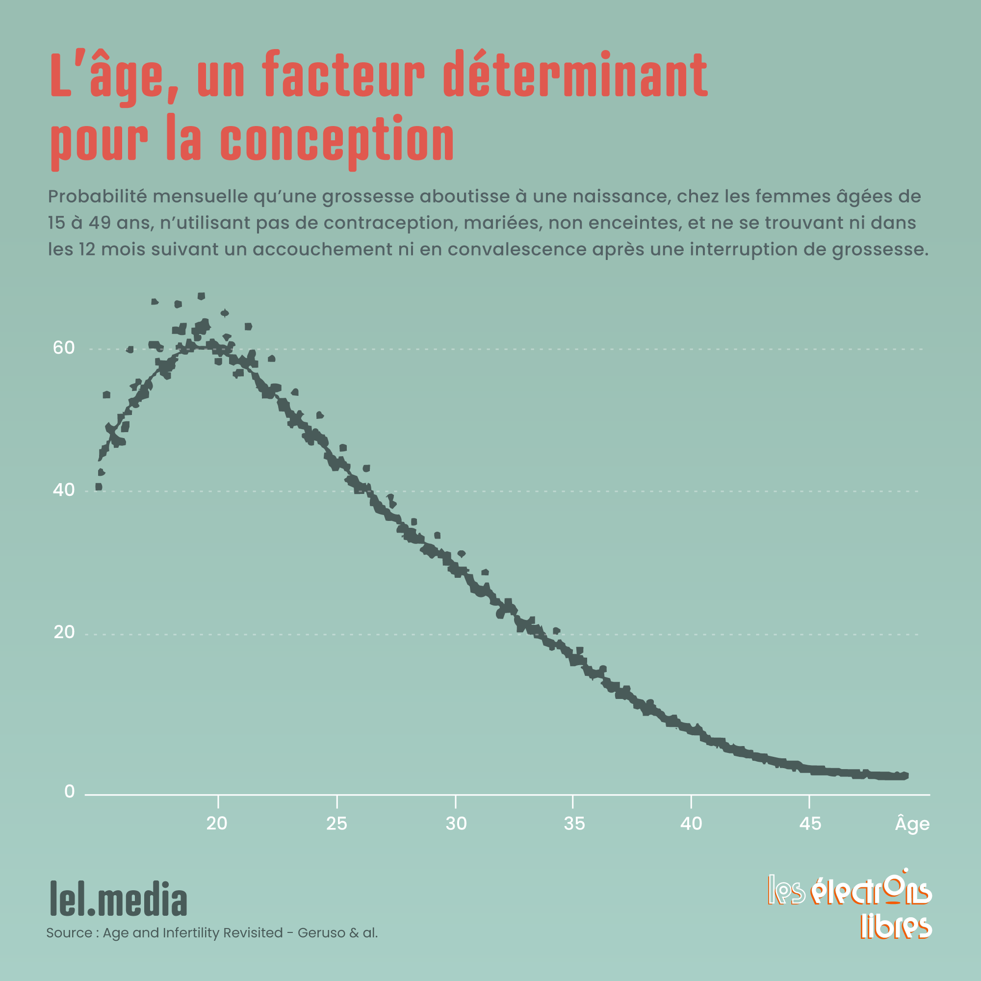À 33 ans, une femme a environ un tiers des chances de concevoir par mois qu’à 20 ans. À 40 ans, 10 %. Et seulement 10 % des femmes savent que la fertilité décline déjà dans la vingtaine.