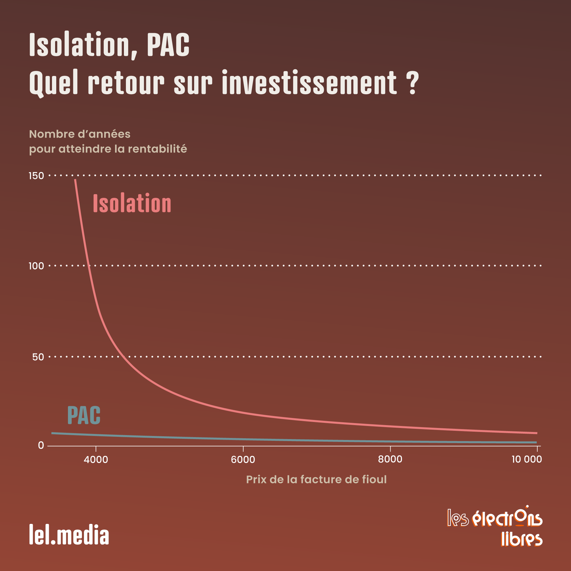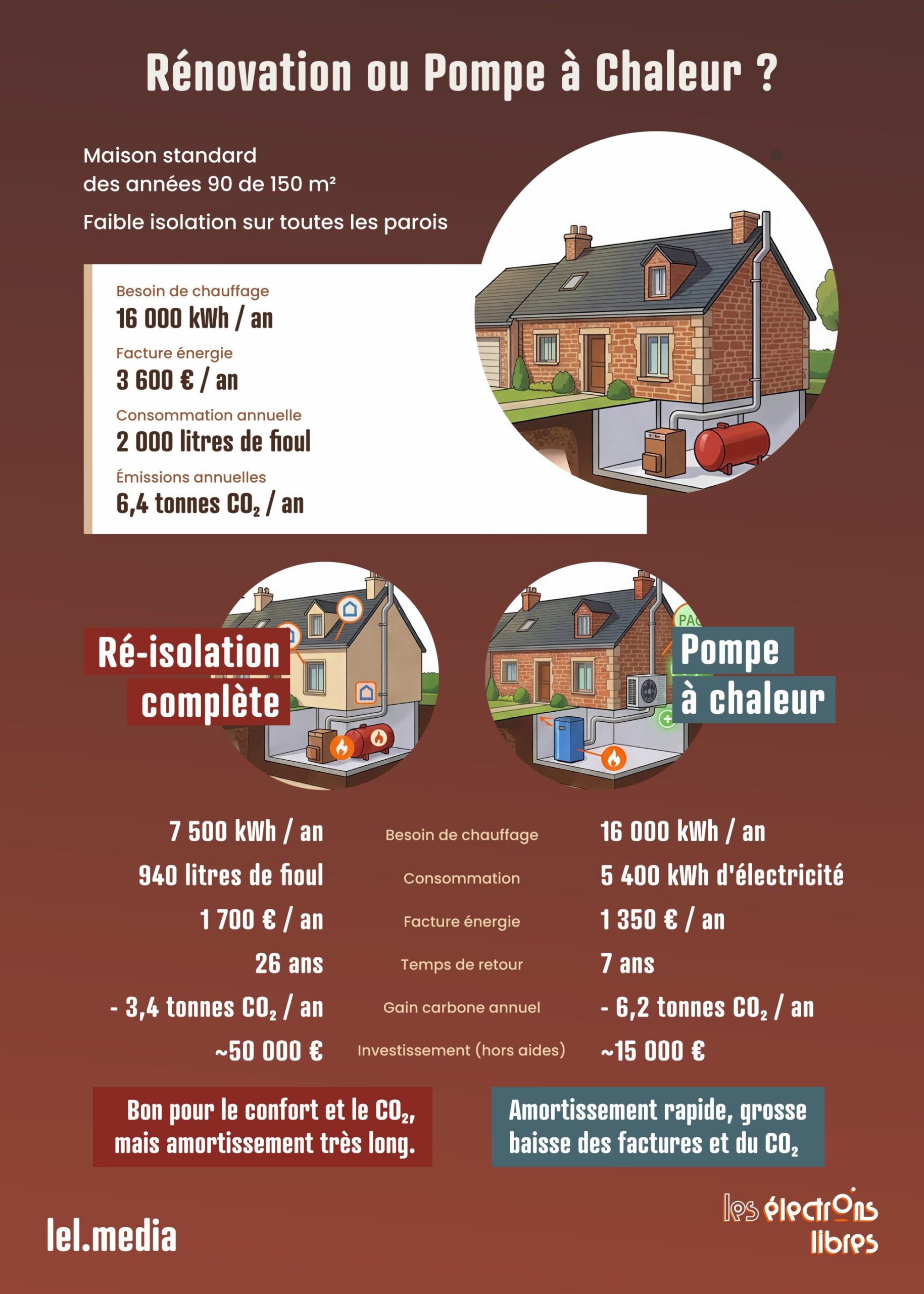 Le match est sans appel. Prenons l’exemple d’une maison standard des années 1990, faiblement isolée, d’environ 150 m². Si elle est chauffée autour de 20 °C, sa facture atteindra facilement 3 600 € pour 2 000 litres de fioul. Réisoler l’ensemble coûtera aisément 50 k€ (hors aides) pour un gain sur la facture d’environ 1 900 € par an. Installer au contraire une pompe à chaleur (sans isoler) coûtera plutôt autour de 15 k€ (hors aides) pour un gain de 2 500 € par an. Le temps de retour sur investissement passe de 26 ans pour l’isolation à moins de 6 ans pour la PAC. Et il en va de même pour le CO2. Les gains d’émissions sont d’environ 3,4 tonnes par an pour l’isolation, contre 6,2 tonnes pour la pompe à chaleur.