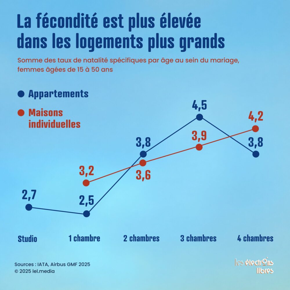 Cet obstacle est particulièrement critique pour les jeunes adultes. L’accès précoce à la propriété entre 20 et 25 ans augmente la probabilité de fonder une famille de 32 %, alors qu’à l’inverse, l’étroitesse des logements actuels contraint 39 % des moins de 30 ans à reporter leur projet familial. Mais, au-delà de la surface brute, c’est la configuration même de l’habitat qui pèse sur la démographie. Le nombre de chambres s’avère en effet bien plus déterminant que le métrage total : le taux de fécondité bondit de façon spectaculaire dès lors qu’un foyer dispose de trois chambres plutôt que deux.