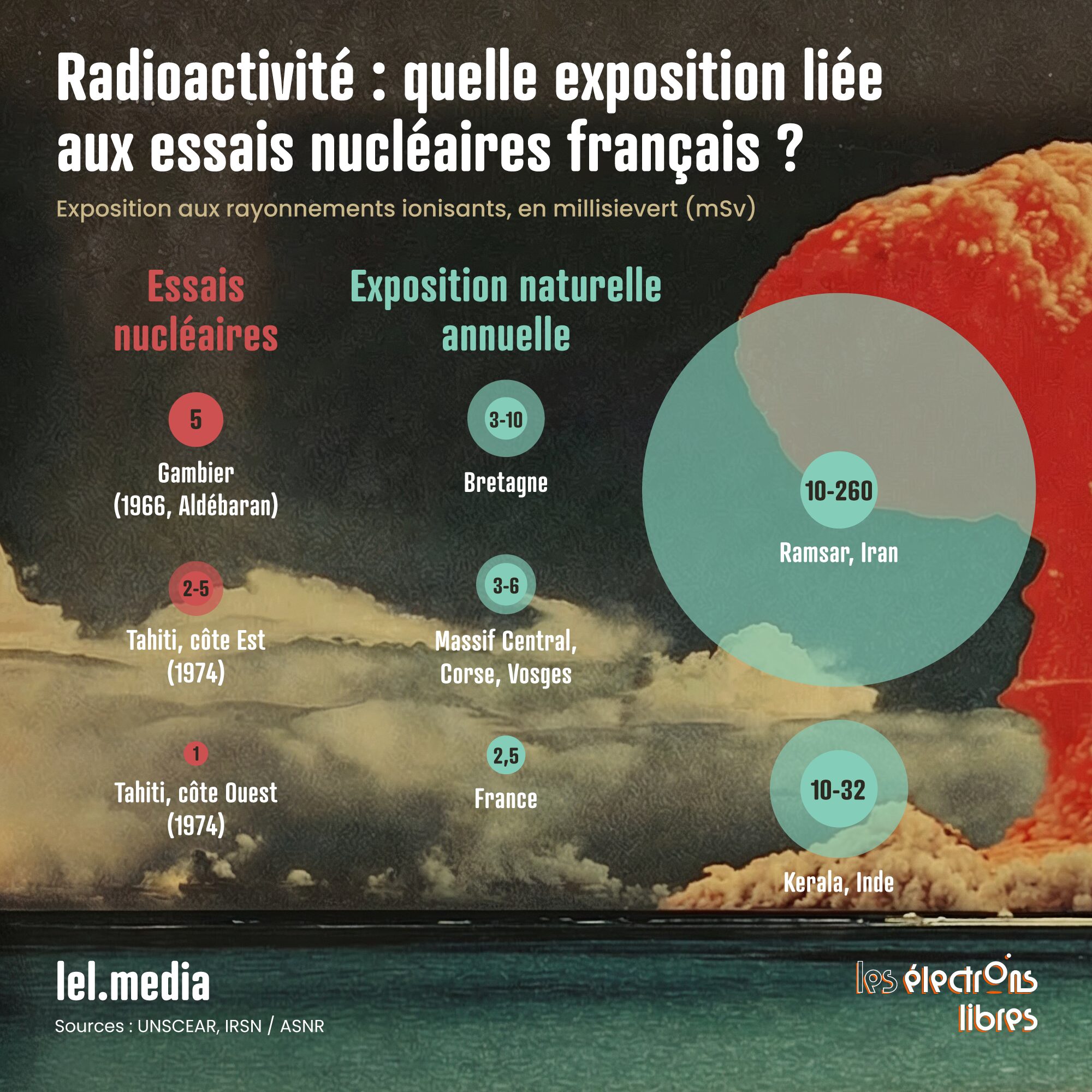 Le premier essai atmosphérique, baptisé Aldébaran, a lieu le 2 juillet 1966. Un désastre. Le nuage radioactif dérive vers l’archipel des Gambier au lieu de la direction initialement prévue, provoquant une contamination des populations locales… qui leur est dissimulée, sans leur offrir de protection particulière. Les autorités estiment l’exposition faible – de l’ordre de 5 millisieverts (mSv), proche des limites alors considérées comme acceptables – et préfèrent éviter toute communication susceptible de susciter un rejet populaire contre des essais présentés comme inoffensifs. Des évaluations ultérieures ont confirmé une exposition moyenne autour de 5 mSv, mais avec de fortes incertitudes liées aux habitudes alimentaires des habitants.
